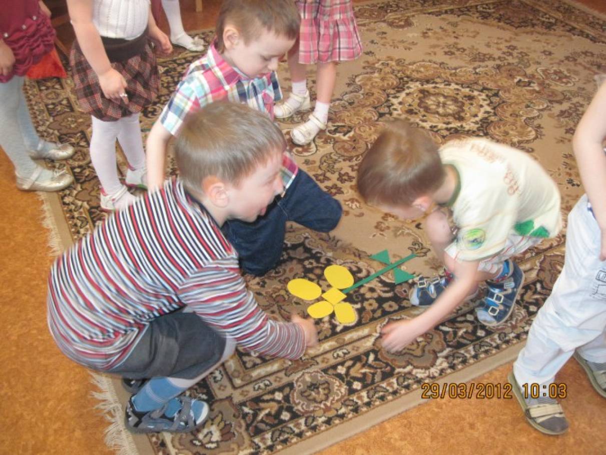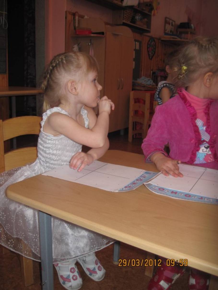 Конспект НОД «В гостях у времени года — весна», средняя группа детского сада![]() Цель НОД: Формирование математических знаний и умений посредством использования комплекта геометрических блоков Дьеныша. Задачи: - Закреплять представления детей о времени года – весна. - Упражнять в умении различать, называть, систематизировать блоки по цвету, величине, форме, толщине. - Вызвать желание эмоционально воспринимать стихотворение, замечать выразительные средства. - Развивать умение чувствовать характер музыки, воображение, логическое мышление, творческое воображение. - Продолжать формировать умение ориентироваться на листе бумаги. - Формировать навык ритмичного движения в соответствии с характером музыки. Материал Раздаточный: Музыкальные инструменты - свистульки, дудочки, металлофон, лира, колокольчики, флейта. Шишки, чурбачки, трещотки, дирижёрская палочка. Карточки кодовые. "Игровизоры" Воскобовича с заданием на каждого ребёнка. Демонстрационный: Коврограф. Карточки кодовые с изображением цветов. Геометрические фигуры. Оборудование: Обруч с лентами, на концах которых пришиты геометрические фигуры разной формы, величины, цвета, толщины. Магнитофон, диск с записью произведения П. Чайковского «Песня жаворонка». Предварительная работа Использование логических блоков на занятиях, в совместной и самостоятельной игровой деятельности. Ход непосредственно образовательной деятельности 1. Воспитатель читает детям стихотворение: ![]() Вот в лесу ещё сугробы, Но проталины видны. Пусть весёлый музыкант Споёт песню для весны. Он на флейте ей сыграет, И весну к нам призывает. (играет на флейте, дети поют) Приди, весна, приди скорей, Всю землю солнышко согрей. Педагог задаёт детям вопрос: - Какое время года наступило? А как вы узнали, что наступила весна? Правильно, по приметам. Назовите приметы весны. (дети называют) Педагог предлагает детям сыграть в музыкальную сказку. /дети разбирают музыкальные инструменты/ Музыкальная сказка «Весна» /на стихи Елены Благиной, В. Суслова Ещё мы все тепло одеты, В куртки, тёплые штаны, Но всё-таки весны приметы Во всём, во всём уже видны. И вот дорога стала влажной, А сапоги водой полны, И ветер, нежный и протяжный, /дудочка Повеял с южной стороны. С крыши кап – кап, кап – кап, /металлофон С крыши кап – кап, кап – кап. Мокрые дорожки. Мы сейчас гулять пойдём, Одевай сапожки. Мы весну встречаем с радостью, весельем, /свистульки В ярком свете солнца, В звонких птичьих трелях. Весна затренькает синицей, Её подхватят воробьи, И отовсюду вереницей Журча, покатятся ручьи. Ветер весеннюю песню запел, /флейта Её поутру соловей просвистел. /свистулька Ёжик её прошуршал на опушке. /шишки В чаще её подхватила кукушка. /дудочка Дятел её простучал на сосне, /чурбачки А ручеёк проурчал меж камней. /лира Две синицы прилетели на сосну, /свистульки Две синицы засвистели про весну: Сколько света, сколько света, Стала синей высота, Скоро лето, скоро лето, Красота, красота! Стадо овец, бубенцами звеня, /колокольчики Песню пропело, к ручью семеня. Гром эту песнь прогремел, что есть сил, /трещотка Дождик проснулся и песнь подхватил. /металлофон 2. Воспитатель предлагает детям покататься на карусели. Но для этого нужно приобрести билеты. 1 вариант. Дети покупают билеты – геометрические фигуры, дают фигуре характеристику по четырём признакам: форма, цв